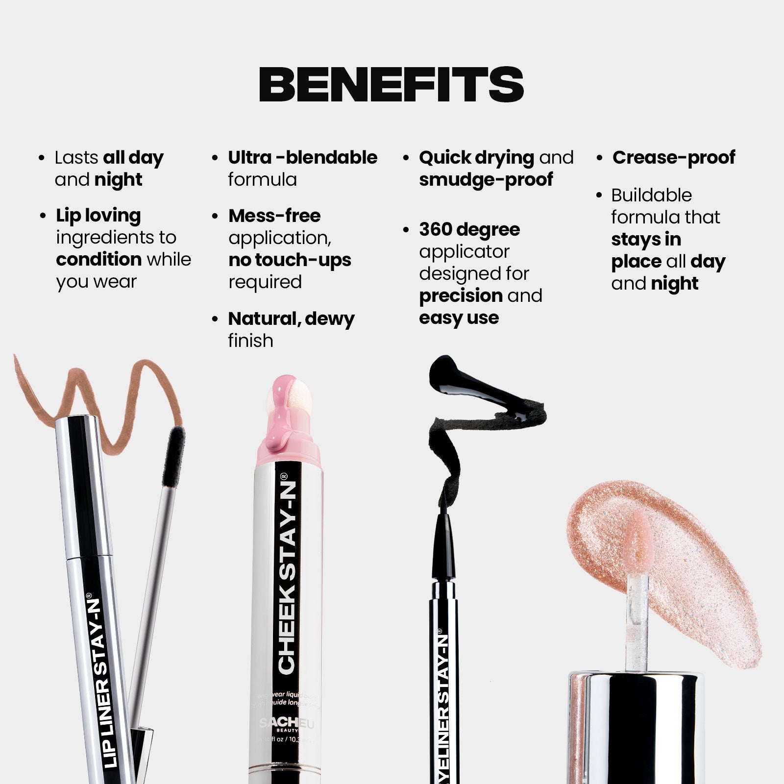 Meet All Day Glam. Featuring the shades SACHEU founder Sarah Cheung swears by, this full face set is your shortcut to looking put together when you only have 10 minutes to get ready. From 8AM meetings to midnight mischief this set STAY(N)s put, no touch-ups required.